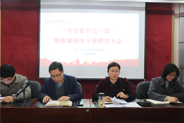 会上,戚书记领学了《中共江苏师范大学委员会关于进一步压实师德师风建设主体责任的实施办法》《江苏师范大学教师师德手册》等文件精神及《教育强国建设规划纲要(2024—2035年)》中有关师德师风的具体内容,并以“湖南省某高校教师成某违反政治纪律的问题”等案例作深入剖析。戚书记教育全体教师要以案为鉴、以案明纪,进一步明确违反师德的严重后果和学校学院对师德失范“零容忍”的鲜明态度,始终模范遵守新时代教师职业行为准则,自觉捍卫教师职业操守,以高尚师德和严谨教风守住三尺讲台。