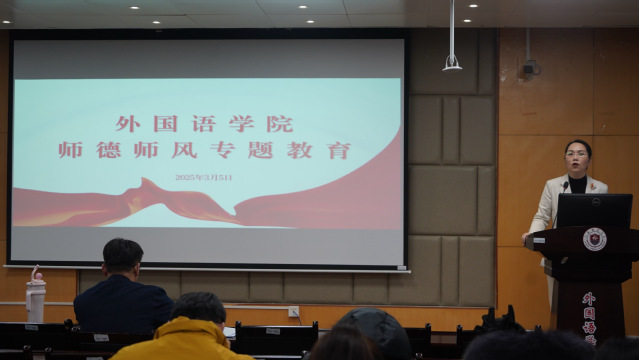 3月6日下午,外国语学院开展教职工“开学第一课”暨师德师风专题教育。全体教师集体观看优秀典型事迹纪录片《国家记忆·教育家精神》,院长于涛作关于《教育强国建设规划纲要(2024-2035年)》的中心组(扩大)学习会专题报告。本次专题教育由学院党委书记庄园主持。