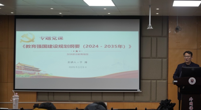 于涛结合学校和学院年度工作重点,深入解读了《规划纲要》的背景、目标和任务,强调了教育强国建设对于国家发展的重要意义。于涛强调,作为外国语学院的教师,要深刻领会《规划纲要》的精神实质,明确自身在教育强国建设中的责任与使命,积极探索外语教育教学改革的新路径;要紧紧抓住改革契机,主动对接国家和区域发展需求,努力提升教育教学质量,为培养具有国际视野和跨文化交流能力的高素质人才不懈奋斗。