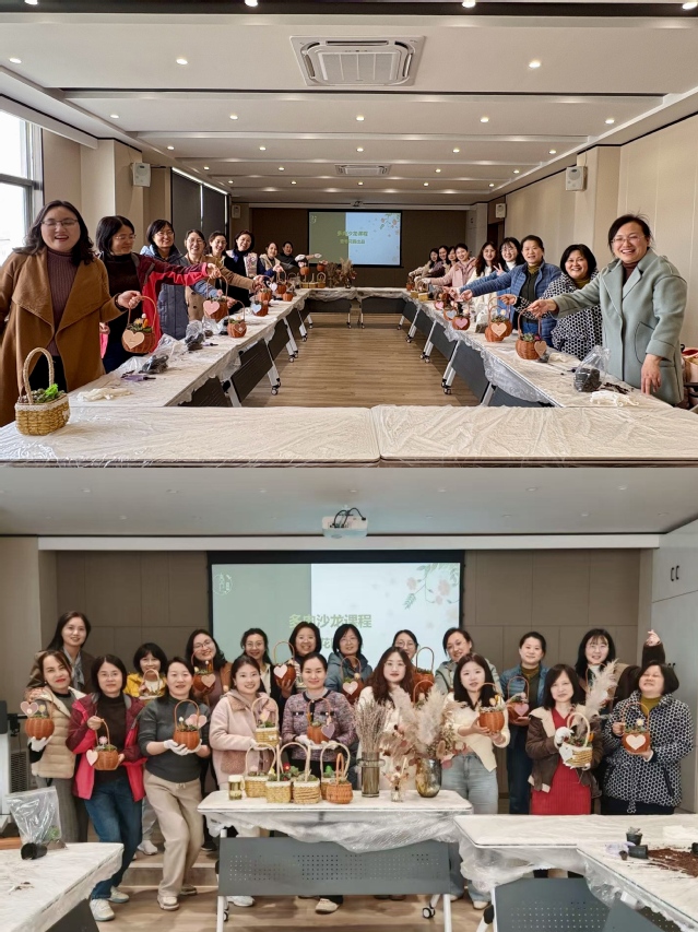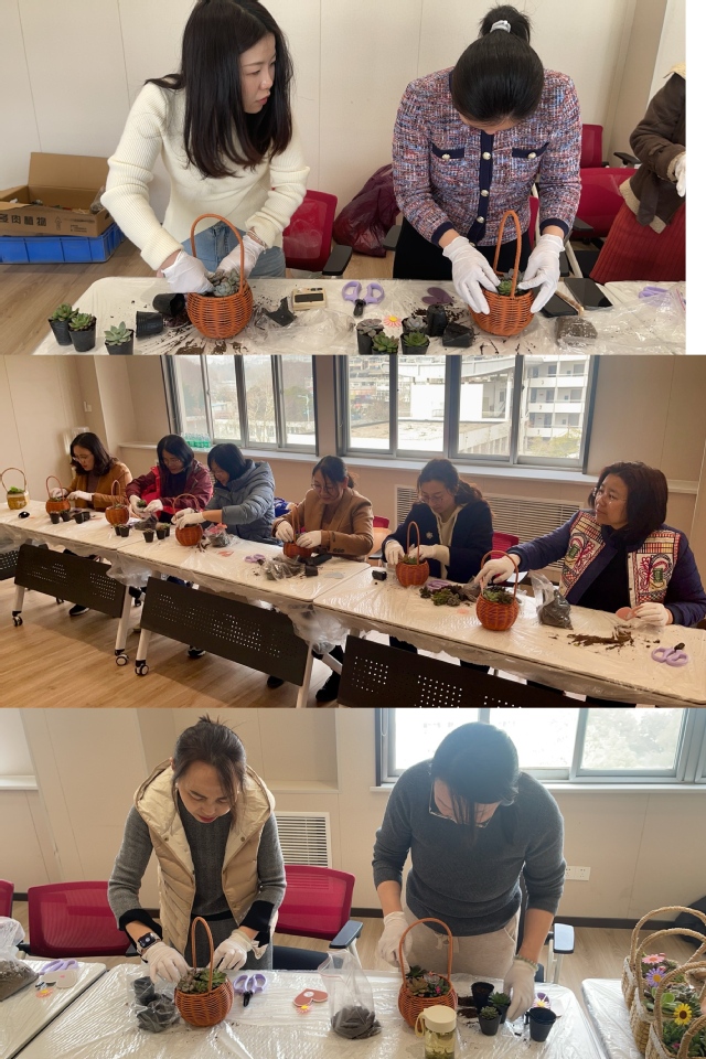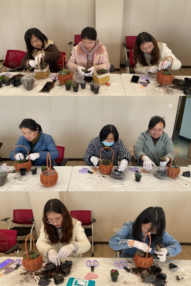 活动伊始,专业园艺师为大家详细讲解了多肉植物的种类、生长习性及养护技巧。教职工们认真聆听,积极提问,表现出浓厚的兴趣。随后,大家亲自动手,挑选心仪的多肉品种,搭配精美的花篮,设计出独具特色的多肉篮栽。