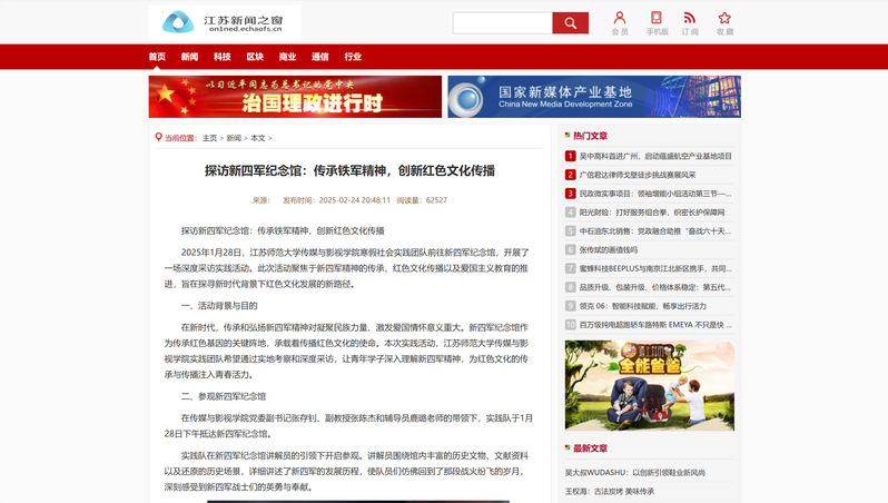 2025年2月24日,中国江苏网报道我院寒假社会实践团队前往新四军纪念馆开展采访实践活动,报道内容如下: