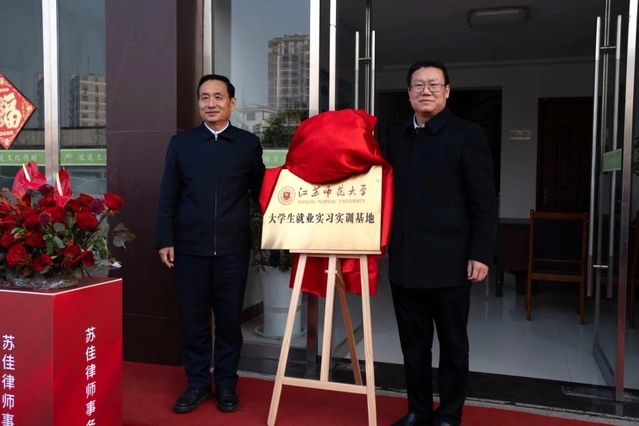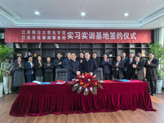 法学院院长菅从进向与会各单位代表介绍了法学院的历史沿革、办学特色、师资队伍建设、人才培养取得的标志性成果、学科建设、平台建设、校地校企共建成果,列举了在涉外法治人才培养、知识产权研究等方面取得的突破性成果,推荐了学院2025届毕业生。参会的邳州市人大、邳州市政法委、邳州市司法局、徐州律师协会等4家单位代表高度认可学院人才培养质量,并结合当前法律服务市场高质量发展转型、基层法治建设等新趋势,就法律事务教学强化、职业伦理塑造、复合能力培养等提出建设性意见。各单位纷纷表示愿意为法学院学子提供更多的实习和就业机会,共同培养适应社会需求的高素质法学人才。双方就合作共建达成一致意向,共同签署了江苏师范大学校企合作框架协议和“苏佳助学助教基金”协议,为江苏师范大学实习实训基地挂牌。