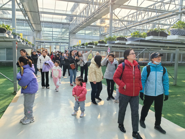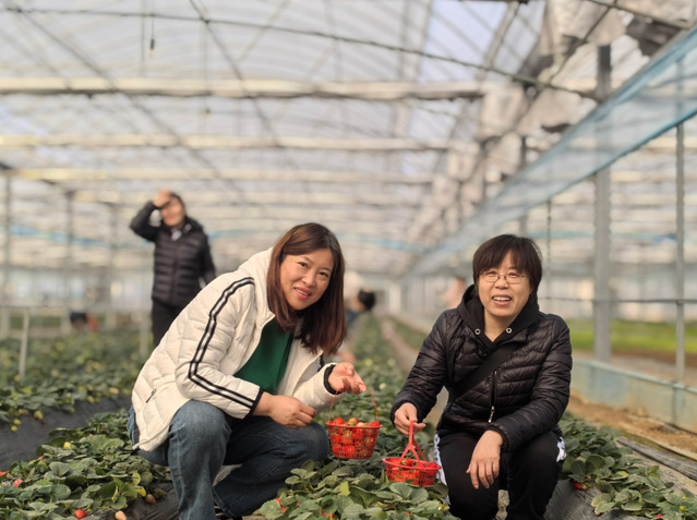 活动当天首先进行了农业观光。走进大棚,各类传感器分布在草莓园的各个关键节点,实时监测着大棚内的温湿度、光照强度、土壤酸碱度等重要数据,智能化种植深化了大家对农业地理的认知。参观结束后,采摘活动正式开始。踏入草莓种植基地,绿叶掩映下的鲜红果实与欢声笑语交织成趣。女教职工们手持采摘篮,穿梭于田垄间,运用专业眼光观察草莓生长状态,探讨果实分布与空间布局、光热水肥的关系。今天的草莓园不仅是劳动乐园,更是实践课堂。