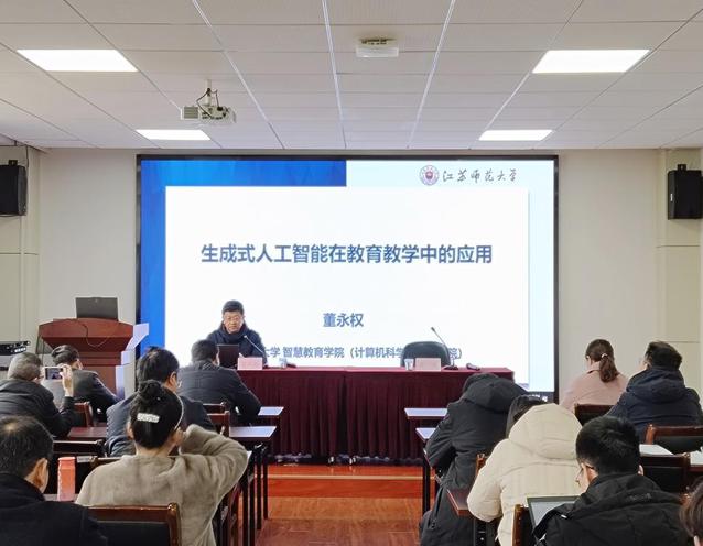 智慧教育学院院长董永权教授以“生成式人工智能在教育教学中的应用”为主题,从当前生成式人工智能的时代背景、发展状况,用详实的数据和行业典型应用,深刻阐述了人工智能技术尤其是认知大模型的最新进展,并演示了大模型的文本生成、语言理解、知识问答、逻辑推理、数学能力、代码能力、多模态能力及在教育、办公的行业应用。董院长结合马克思主义学院学科和专业的特色,通过展示实际案例与数据,贴心地向大家展示了许多人工智能工具的使用方法与技巧,以及如何利用人工智能技术实现教学内容的精准推送、学习路径的智能规划,为之后的教学内容和教学方法提供了新的思路与方法。参加讲座的教师们对人工智能在教学中的应用有了更为清晰和深刻的认识,也为学院未来在教育教学改革与创新方面提供了新的思路与方向。