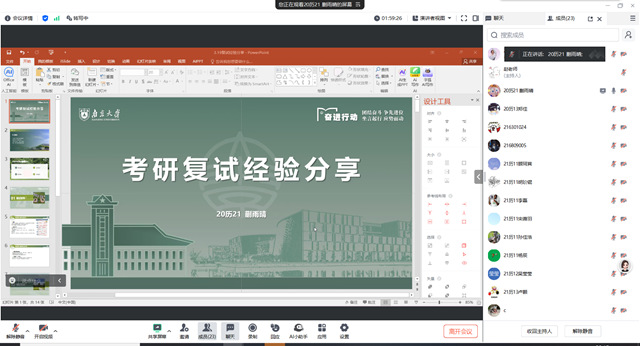 线下讲座部分,赵老师首先介绍了当前的就业形势,以及学院各个专业近年来的就业状况,希望广大同学尽早做好职业规划,提升专业技能。随后由学院邀请的专业讲师就考编、考公、考研及自由就业问题等内容进行了讲解,对于公务员考试的有关国家政策和发展前景,进行了详细的介绍和说明。讲座后,主讲老师与广大同学就有关细节问题进行了互动交流。随后进行的线上讲座,学院邀请了考取本校、外校的5位在读研究生,就各个专业的面试及调剂的有关内容,向同学们传授经验。