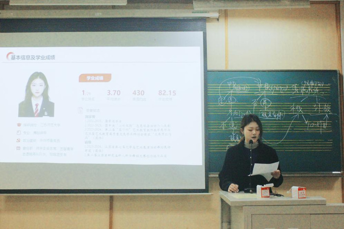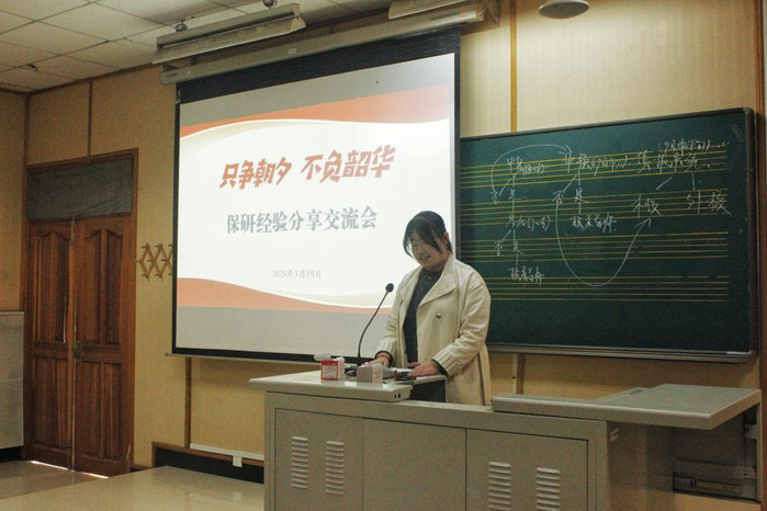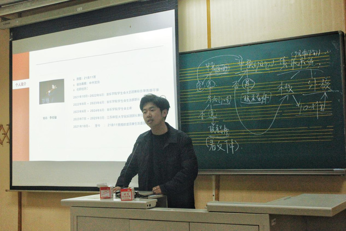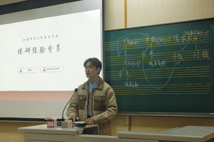 李佳骏同学顺利保研至上海大学的音乐教育专业。他向同学们介绍了自己入学三年多以来的成长足迹,归纳总结出音院“铁人三项”,并向大家介绍了音乐生保研的主要专业方向及其各自形势。他补充说明了普通推免计划的相关要求,鼓励同学们努力提升自身专业素养,积极参与实践,锻炼综合实力。