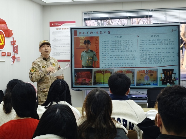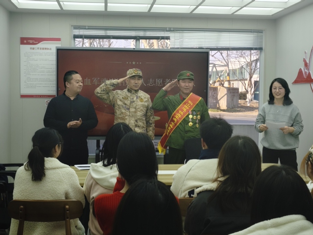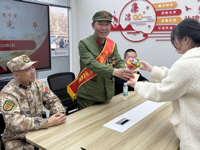 活动第二阶段,泉南一站式社区内,文雯为师生代表介绍了战时三等功获得者、越战老兵徐远见的英雄事迹,并对刘晓丰和林玉仕的到来表示欢迎。徐远见分享了在对越自卫反击战中涌现出的诸多英雄故事和亲身经历,讲述战火纷飞的年代,革命先烈无私无畏的奉献精神。林玉仕分享了当代退役军人“绿军装”爱心组织弘扬“雷锋精神”的先进事迹,并生动讲述了、带领退役军人志愿者积极投身抗洪救援、传播红色文化的感人经历,诠释了“退役不褪色,奉献永流传”的生动誓言。学生党员向两位老兵进献手工花束,轨道交通专业学生代表蒋溢结合纪念园内陈列的73位徐州籍烈士英雄名录,向全体同学发出倡议:“立志用‘钢轨延伸处即创新扎根处’的精神,积极投身轨道交通关键技术攻关,为交通强国目标贡献青春力量!”