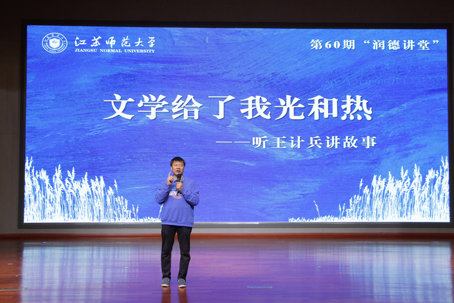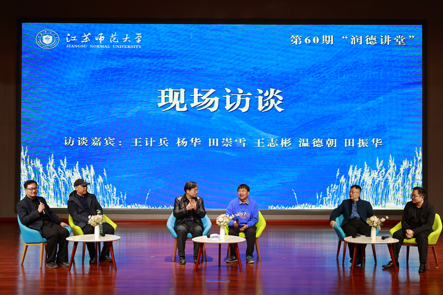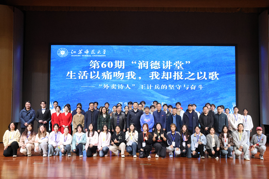 访谈环节,文学院田崇雪、王志彬、温德朝、田振华五位老师以及徐州市作协副秘书长杨华与王计兵展开深度对话。田崇雪评价其诗歌“来源于生活、根植于大地,有切肤之痛”,当下诗歌创作应秉持“修辞立其诚”;王志彬现场吟诵即兴创作小诗,感谢“外卖诗人”给江苏师范大学送来“精神食粮”,并表示每个人的人生都是一场“外卖”、都是一首诗,每个人的梦里都有远方;杨华以老友的身份对王计兵为人和创作颇有赞誉;温德朝表示王计兵的诗歌语言粗粝、真实,情感充沛,洋溢着积极向上昂扬不屈的精神力量;田振华表示,AI时代下,个体的生命体验弥足珍贵,当一切元素都被AI取代时,便是文学重生的时刻。现场学生踊跃提问,王计兵结合问题分享了成为“外卖诗人”的经历,并谈到文学创作真诚是第一位,还现场为师生深情朗诵其诗作《娘》。现场文学爱好者潸然泪下。