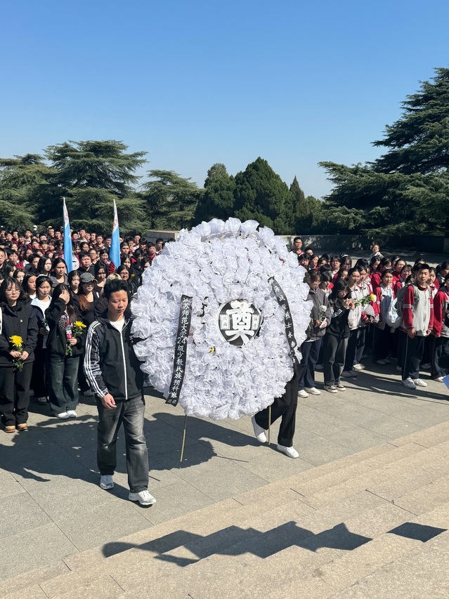 公祭仪式遵循传统礼制有序展开:全体人员垂首默哀三分钟。学生代表王昱涵、王禹铮缓步上前,将素雅花圈敬献于烈士碑前,寄托深切哀思。任如玉同学以饱含深情的语调宣读悼词,追述淮海战役壮烈史诗。在团支书梁家瑶的领誓下,全体团员高举右拳重温入团誓词,铿锵誓言响彻云霄。随后,同学们拾阶而上,将小雏菊轻轻放置在烈士碑前,并怀着崇敬之情绕塔而行,凝视浮雕长廊间镌刻的三万余名烈士英名,触摸历史留下的温度。