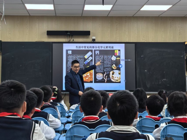 课堂伊始,姜波教授以“化学元素的奇妙世界”为主题,将化学史、科研前沿与生活实例巧妙融合,让深奥的元素科学变得妙趣横生。姜教授生动地讲述了元素周期表的诞生,以及门捷列夫如何在梦中得到灵感,发展成了今天我们所熟知的周期表,并介绍了当前化学元素研究的最新进展与运用。为了使抽象的化学概念更加生动,姜波教授穿插了许多生活实例,成功地将原本深奥难懂的化学元素科学,转化为一个充满趣味和实用性的奇妙世界。课堂上,学生们积极提问与互动,整个教室洋溢着探索科学的热情和活力。