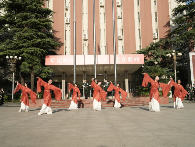 早上七时整,升旗仪式正式开始。国旗护卫队步伐坚定,目光如炬。伴随着雄壮的国歌声,五星红旗冉冉升起,全体师生肃立,面向国旗行注目礼。文学院党委副书记彭晨发表题为《传承教育家精神,争做新时代“大先生”》的国旗下讲话,她寄语中文学子,需以“小学生”姿态夯实为师之基、以“工程师”情怀践行为师之责、以“建设者”站位铸就为师之魂,号召青年学子保持中文人的初心,以青春之我、奋斗之我,勇立时代潮头,肩负文化使命,争做新时代“大先生”。活动中,文学院朗诵队献上《青春的使命》主题朗诵,以铿锵之声展现青年的坚韧意志与坚定信念;文学院舞蹈队通过《世界赠予我》的精彩表演,深情诠释了“以青春热血书写时代篇章”的崇高理想。升旗仪式结束后,全体师生在国旗下合影留念。