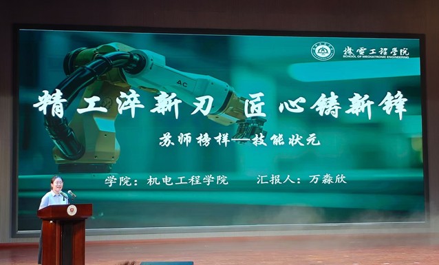 4月9日,江苏师范大学2024年度“苏师榜样”评选活动在马可音乐厅盛大举行。经过学院推荐与学校初评,33名优秀学生成功入围“苏师榜样”优秀大学生评选活动风采展评环节。在激烈的竞争中,我院2021级机械设计制造及其自动化专业的万淼欣同学脱颖而出,凭借出色表现,荣获2024年度“江苏师范大学榜样技能状元”荣誉称号。