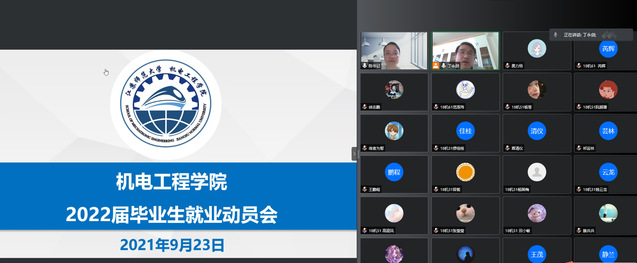 为进一步做好2022届毕业生就业工作,帮助毕业生认清就业形势、熟悉就业政策、把握就业机会,9月23日下午,机电工程学院召开2022届毕业生就业动员会。机电工程学院2022届全体毕业生参加了线上会议。机电工程学院党委副书记陈晓林、就业辅导员丁永剑参加了动员会。动员会由丁永剑老师主持。
