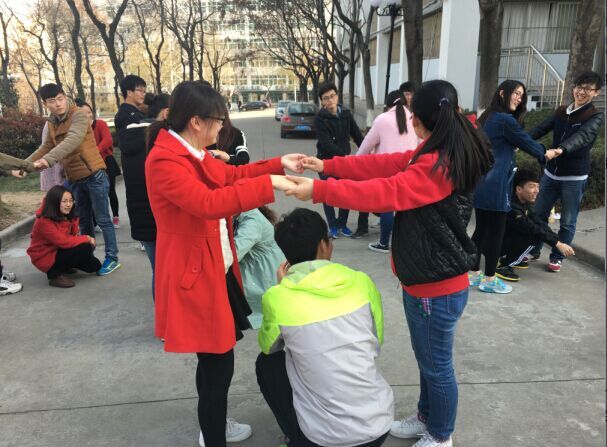 活动伊始,薛老师让每一位参与者手牵手围成一个圈,这看似平淡的举动却让在场的学生们“羞于伸手”。在接下来的“微笑握手”和“橘子苹果”、“男神女神”环节中,大家慢慢融入到了温馨的气氛中,牵手也成了彼此之间和谐的音符;随后,紧紧围在一起的大家做起各种游戏,如“炯炯有神”、“滚雪球”、“马兰花开”、“松鼠大树”、“鸡蛋小鸡凤凰”等,更有后者双手搭在前者肩膀上、几十人合跳兔子舞的游戏,欢快的舞步活跃的气氛使得每一个人逐渐体会到了团队的乐趣。随着活动的深入,一场信任之旅渐渐展开,“分家”后产生了五个小组,每个小组又同时进行了“信任背摔”、“盲人正方形”的游戏,大家运动着集体的智慧,紧紧凝聚在一起感受团队的力量。在最后一个环节“搀扶盲人”中,同学们随机列成两队,其中一人闭上双眼由身边的人搀扶着走过一段旅程,接着信任又在彼此之间传递。最后,大家围坐在一起,是玩累了或是玩饿了,可这些都已不重要,每一个人都深刻地感受到了这个团队的温暖与力量。