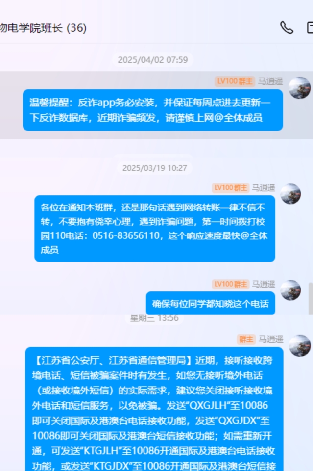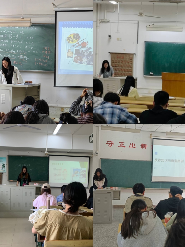 一是进行全员线下反诈宣传轮训。自3月17日开始,在校保卫处的支持下,学院邀请徐州市和铜山区的反诈民警按年级对学院1811名本科生和研究生进行集中线下反诈宣传轮训,每周轮训一个年级,并压实签到制度,对因故没能参加当次轮训的学生,自动编入下次轮训名单。自4月21日开始,对还未进行轮训的年级,编入学校举办的反诈宣传培训班进行集中培训。鉴于21级本科毕业生部分在校外求职的情况,实行辅导员包挂制度,每个辅导员包挂一个毕业班,采取线上线下相结合的方式召开主题班会,确保每生参加一次完整的反诈培训,切实提高学生对电信网络诈骗的系统认知。下一步,学院还将进一步完善辅导员防范电信网络诈骗的包挂制度等措施,确保反诈宣教实效。同时,学院还将组织开展反诈知识竞赛,检验反诈宣教实效,并以竞赛为抓手再次督促同学们加强反诈知识学习。