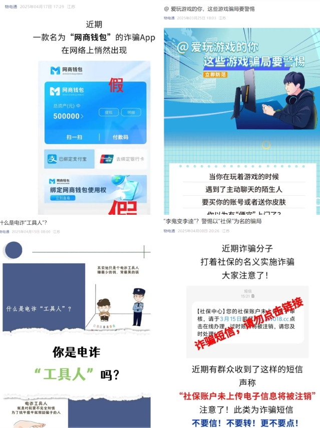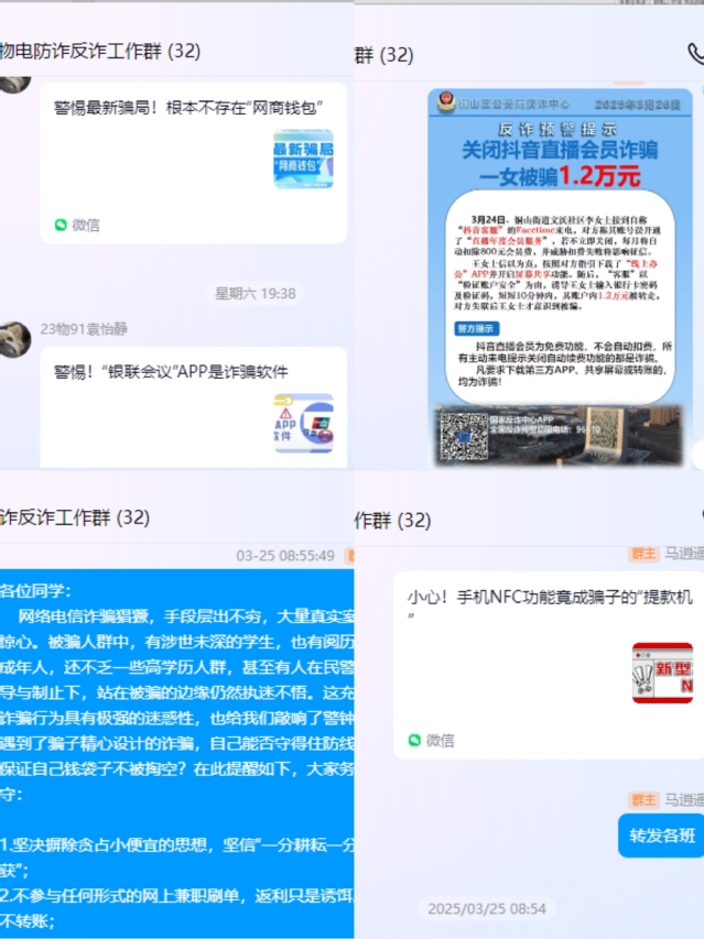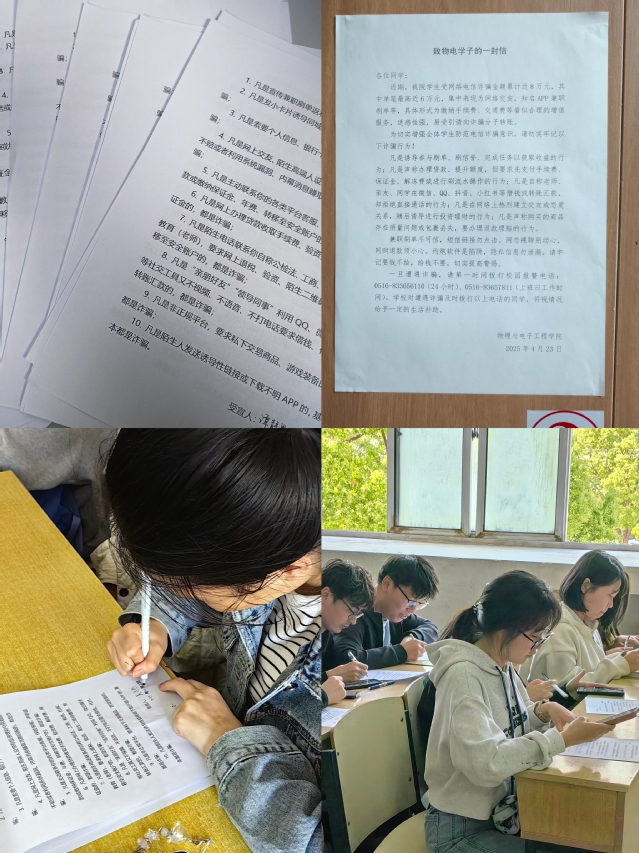二是利用多样化平台开展线上线下反诈宣教。利用“物电通”微信公众号和反诈工作群组两个平台,做好线上反诈微视频、微贴士、微提醒的下达和学习。每周二、四、六通过反诈工作群组推送一次反诈相关知识和提醒,明确班级宣传委员专门负责转发并组织班级同学学习。在院学生组织新媒体中心选拔学生干部组成反诈宣教小组,专门负责在“物电通”微信公众号上制作并推送具有针对性的反诈内容,每周推送三次,由班主任和宣传委员负责组织本班进行学习。在线下,充分发挥物电学院7号楼一楼通道的地理位置优势,长期悬挂“给钱不要、要钱不给”等反诈宣传条幅,对校内途经本通道的所有学生进行长期熏陶。撰写并在每间学生宿舍张贴反诈主题的《致物电学子的一封信》,同时利用宣传栏、电子屏、海报、展板等传统方式,广泛宣传,营造全员反诈的良好氛围。