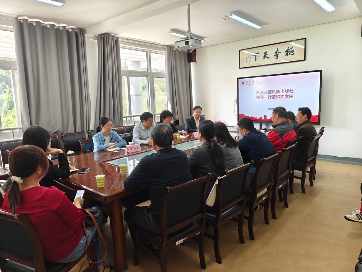 王立增院长对林日波总编辑一行表示热烈欢迎,并简要介绍了江苏师范大学文学院的基本情况。林日波总编辑系统介绍了凤凰出版社的发展历程与核心业务等。许勇副主任重点分享了近期推出的“江南文脉”编纂情况。交流环节,文学院中国古代文学专业、中国古典文献学专业教师就古籍整理、学术著作出版转型、科研项目合作申报、学术资源共享等议题展开热烈讨论。
