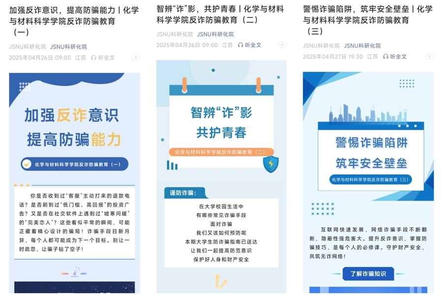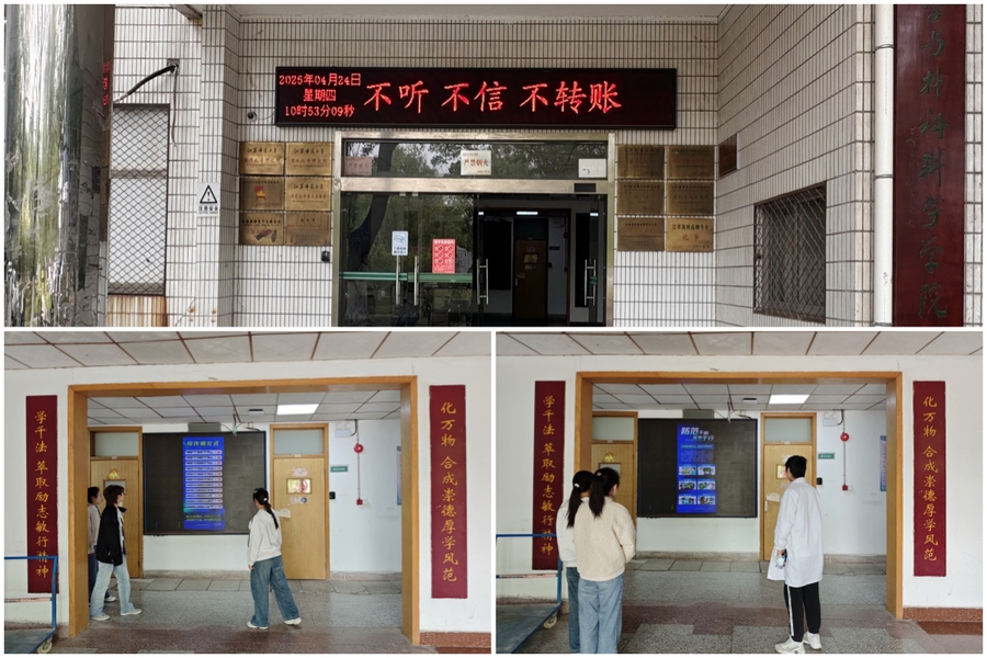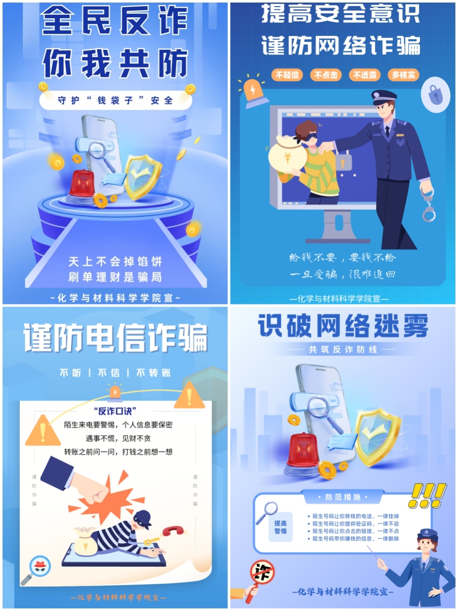为深入贯彻落实学校“校园反诈宣传周”工作部署,切实增强师生防范电信诈骗意识,化学与材料科学学院近期以“全员反诈,守护校园”为主题,开展了一系列富有成效的反诈宣传活动,织密织牢校园反诈防护网。