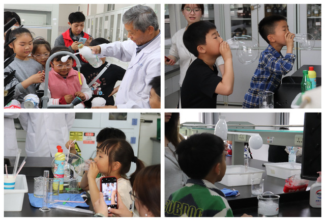 随后,小朋友们来到趣味实验课堂。李广超教授用生活中常用的洗洁精、白砂糖等材料配制小朋友们喜爱的泡泡液,通过简单有趣的泡泡实验为小朋友们讲解了液体表面张力等知识;之后,李广超教授又为大家讲解了干冰的性质和干冰产生烟雾的原理,给小朋友们展示了干冰空气炮和干冰泡泡制作方法,引发小朋友们的阵阵欢呼。