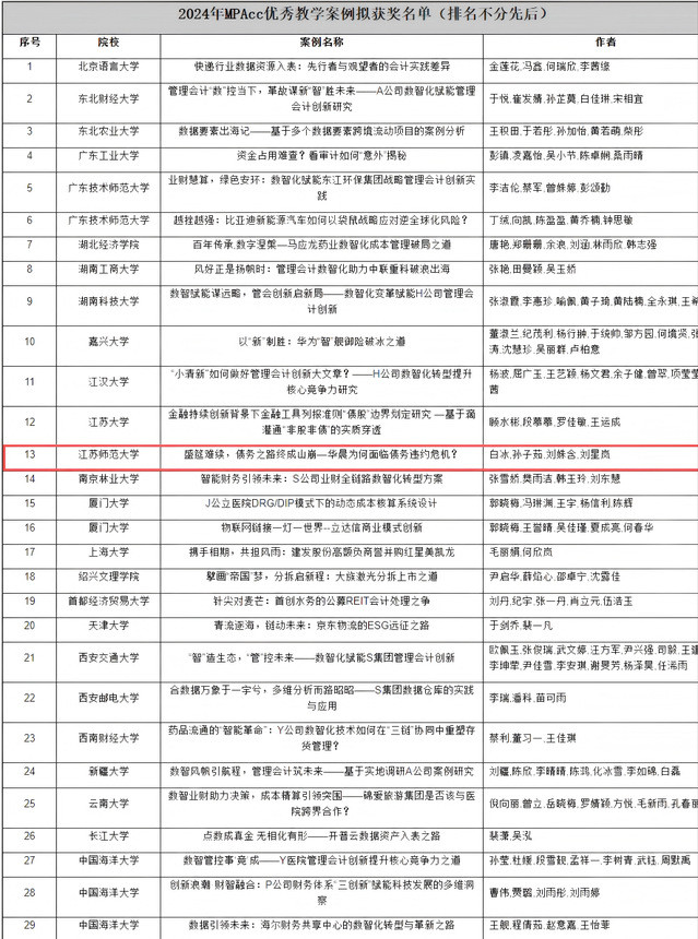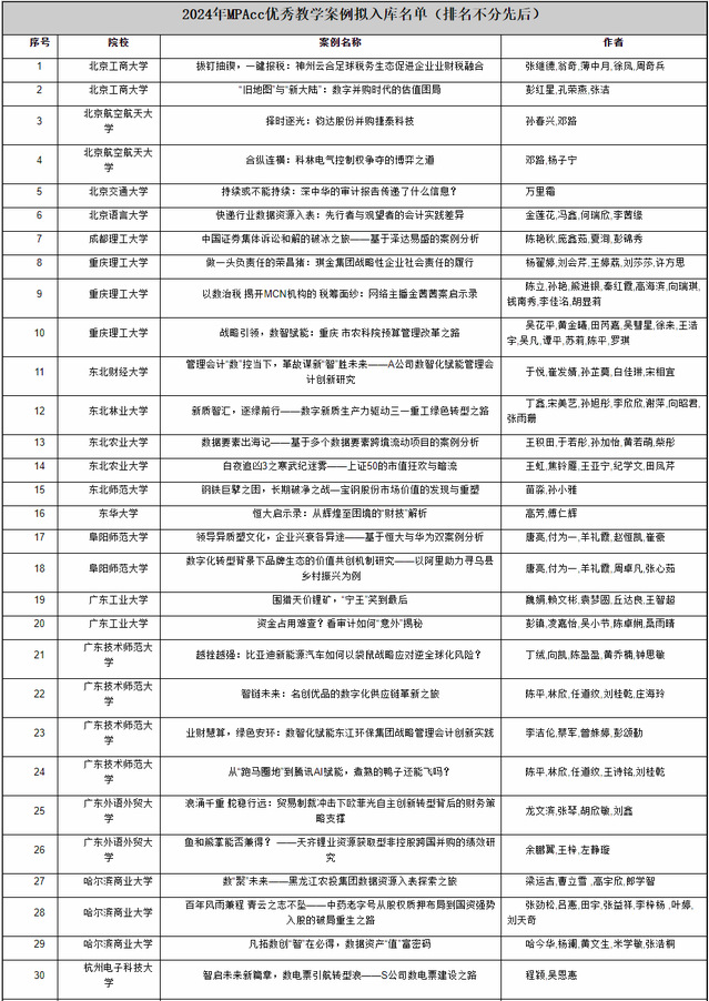 近日,全国会计专业学位(简称MPAcc)研究生教育指导委员会公布了2024年MPAcc优秀教学案例奖和入库案例,我院白冰老师、苗连琦老师编写的2篇案例分别入选。