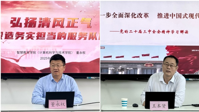 以党建引领固本强基,筑牢思想根基。学院将党建工作作为固本强基的核心引擎,通过思想铸魂与制度强基双向发力。院长董永权在 “弘扬清风正气锻造务实担当的服务队伍” 专题党课中,结合高校违纪违法典型案例,深入剖析新时代高校廉洁教育的内涵与实践路径,提出 “制度规范化、教育常态化、监督立体化” 建设目标与提升策略,要求行政团队以高效协同和主动服务意识践行育人使命。发展规划处处长(综合改革办公室主任)王本贤深度解读党的二十届三中全会精神,从会议背景、重大意义、重点任务等多方面阐述,聚焦《中共中央关于进一步全面深化改革、推进中国式现代化的决定》核心论断,结合学校发展实际思考政策落地路径,鼓励教师将全会精神转化为教育教学和管理服务的具体行动,在深化改革中坚守育人初心。两场培训通过案例警示与政策解读,强化教职工政治素养与廉洁意识,为学院发展拧紧思想“总开关”,夯实党建引领的基石作用。