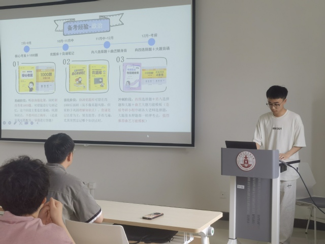 为进一步加强学风建设,发挥优秀学子的榜样引领作用,营造良好的考研氛围,增强学生考研信心与备考动力,商学院于5月14日下午2:30在泉山校区西教14号楼东301举办2025届考研学子经验分享会。此次分享会邀请了我院考研成绩优异的学生代表2021级本科生丁森、钱科振、俞智轩三位同学进行考研经验分享。