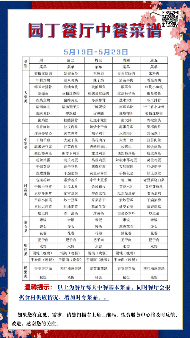 根据大数据分析,餐厅11:25-11:35、11:45-11:50、12:00-12:05三个时间段为就餐高峰期,为了减少排队等待时间,老师们可以选择错峰就餐。餐厅所有食材当天购买、当天使用,菜品新鲜,安全卫生。