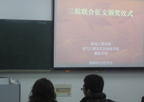 机电工程学院、电气工程及其自动化学院、测绘学院的学生会主席,此次征文活动的部门主要负责人均出席了此次颁奖仪式。首先由三院的学生会主席致词,对所有的获奖同学表示祝贺,并共同希望以此次活动为契机,加强工学院三个学院间的交流与合作,增强工学院的整体凝聚力。接下来便对此次征文活动中获奖的同学进行颁奖,台下响起阵阵热烈的掌声。