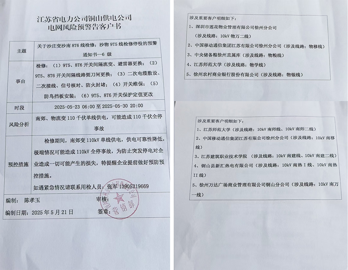 2025年5月21日18:07接国网徐州市铜山区供电分公司营销部停电预警通知:2025年5月23日6:00至2025年5月30日20:00铜山供电公司对南郊变电站、物流变电站110Kv供电线路进行检修,期间南郊变电站、物流变电站110Kv单线运行,供电可靠性降低,极端情况下可能造成全停事故。