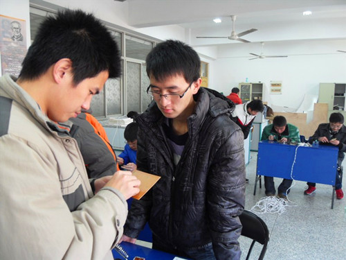 此次活动首次向大家讲解了使用电烙铁的要领及注意事项。朱祥学长给同学们例举了焊接在生活中的应用,为大家讲解了电路布局的要领,并亲自动手让同学们近距离学习了焊接的过程。本次课程的实验内容是全桥整流电路的制作。主讲人朱祥向同学们示范了实验的步骤并将实验心得总结为四点。 其一,同学们应熟练掌握焊接的基本要领;其二,此次试验初次使用先上锡,同学们要避免材料的浪费同时注意安全问题;其三,同学们要认真区分发光二极管正负级;其三,同学们要注意线路布局,不要发生跳线问题。在听完学长的指导后,同学们对焊接都有了更深的了解。他们结合所学要点,认真实践,很快便掌握了焊接的众多要点。