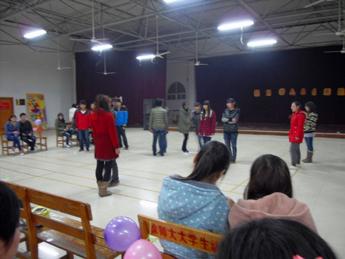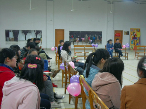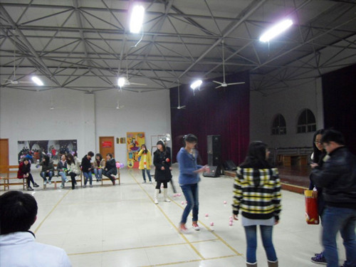 进入会场前,工作人员给参加晚会的每位女生分发了带有序号的卡片。同学们将借此参加抽奖活动,被抽中的幸运女生将得到由外联部为其准备的精美礼品。晚会在同学们初次尝试的交际舞中开始了,首先开始的游戏是“抛绣球”。女生背对男生抛绣球,接到绣球最多的组合将获得奖品。 这是考验队友间配合与默契的游戏,游戏中男生狼狈的姿态让同学们发出阵阵欢笑。在随后进行的游戏中,最有意思的要数踩气球与吃甘蔗大赛了。同学们害怕被踩的惊叫声盖过了他们脚上气球碎裂的声响,而男生们夸张的吃甘蔗速度也让女生们惊叹不已。