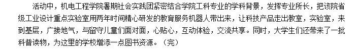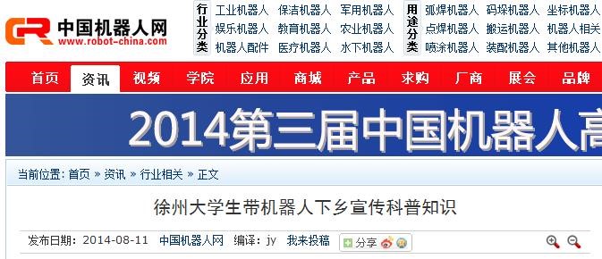 根据团苏师大委﹝2014﹞19号《关于开展2014年大学生志愿者暑期文化科技卫生“三下乡”社会实践活动的通知》文件的要求,机电工程学院于7月底前往宿迁市泗洪县开展了“科技产品接地气,放飞梦想走基层”关爱农村留守儿童爱心助学活动,把“教育服务机器人”带到了广大留守儿童的面前。