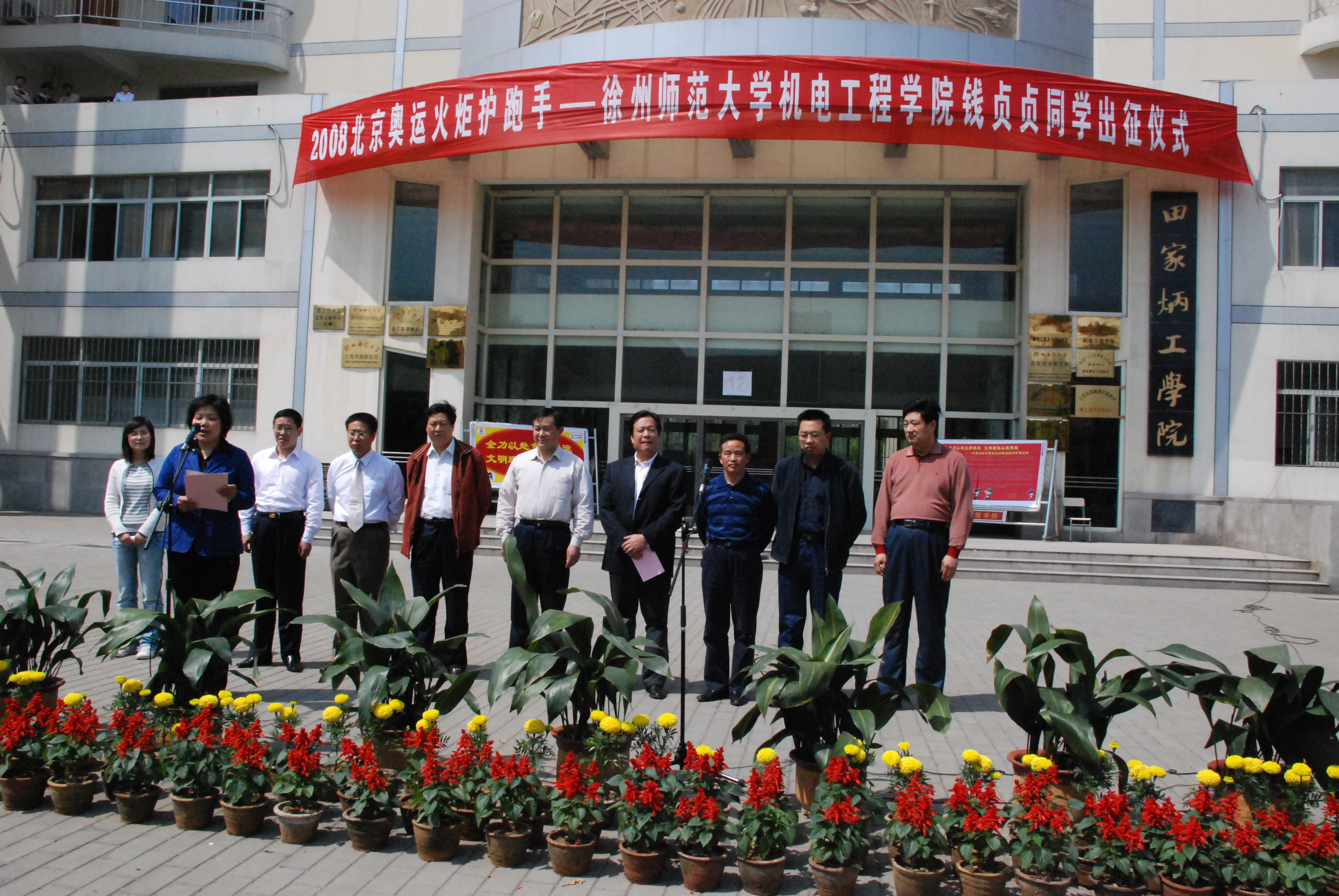 5月14日下午2:00,机电工程学院全体师生员工在工科大楼前举行了北京奥运火炬护跑手――徐州师范大学机电工程学院钱贞贞同学出征仪式。校党委副书记胡相峰、副校长韩宝平、宣传部部长王晓三、校团委书记崔成前、机电工程学院党总支书记施春华、机电工程学院院长韩继光、副院长王柏华、邢邦圣出席了本次出征仪式,机电工程学院副书记赵玉苏主持活动。