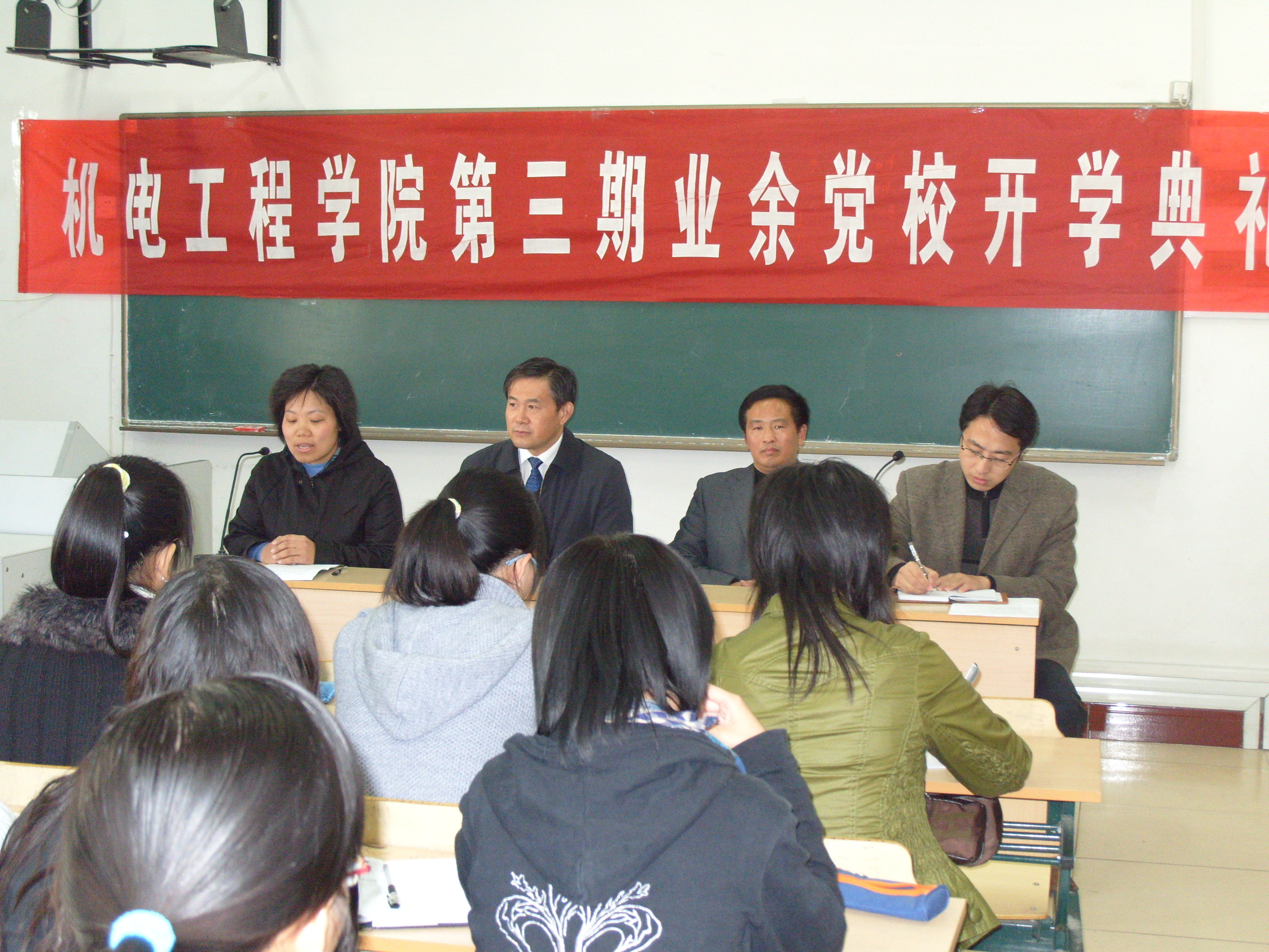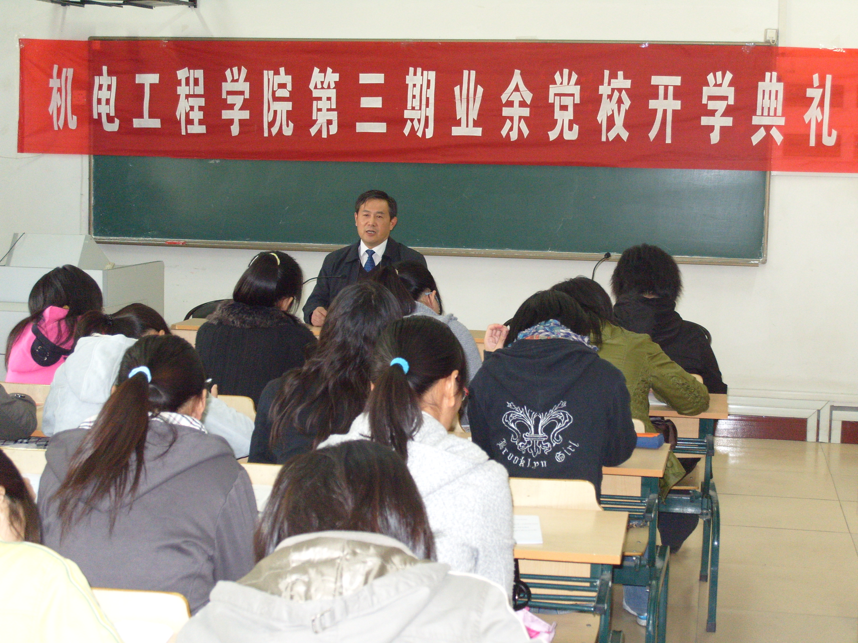 11月12日下午2:00,机电工程学院在工学院604C室举行了“机电工程学院第三期业余党校开学典礼”。校党委胡相峰书记、机电学院党总支书记施春华、副书记赵玉苏、秘书汪为春及66名党校学员参加了本次典礼。典礼由赵副书记主持。