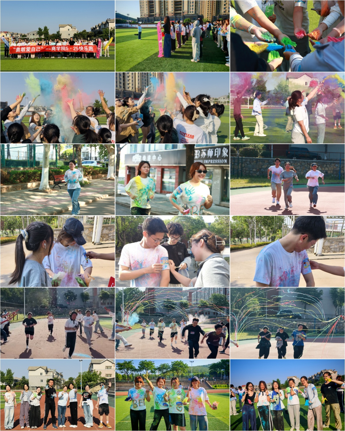 5月25日是全国大中学生心理健康日,为倡导“绿色·健康·运动”的生活方式,丰富校园文化生活,促进商学院师生身心健康成长,提高身体素质,展现师大师生的精神风貌,2025年5月25日,商学院在泉山校区开展了“勇敢爱自己”5·25师生快乐跑活动。此次商学院师生快乐跑活动采用“彩虹跑”形式,师生奔跑的身影被绚丽的色彩包围,点燃了校园活力。
