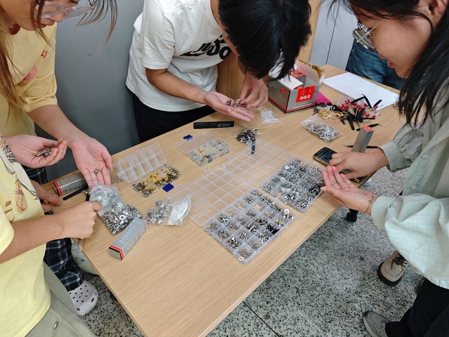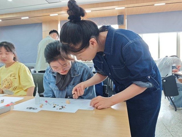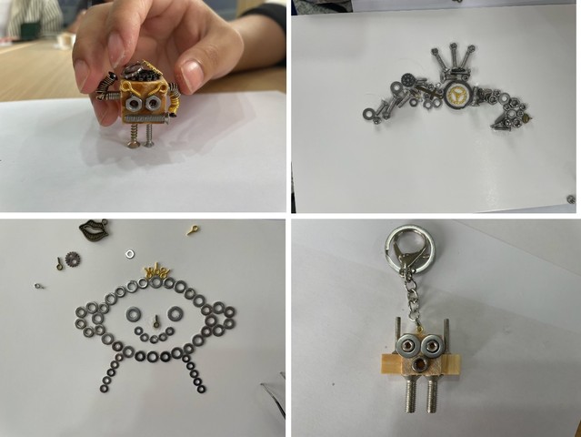 活动现场,首先由赵宁老师讲解机械零件拼贴画艺术起源、历史背景和现实意义,以及进行机械零件拼贴画的实用技巧、艺术构图方法等,为同学们提供理论指导,并通过实例演示帮助同学们更好地理解拼贴创作的要点与注意事项。接着,同学们自行开启“盲盒零件包”,将零件自行组合开展艺术创作。随着“咔嚓”开封声,同学们手中的零件像被赋予了新的生命 —— 有人拿到齿轮与链条,立刻构思出“时间齿轮”的动态构图;有人对着螺母与垫片,突发奇想拼贴出“机械花朵”等等。在此过程中,赵老师全程跟进,为同学们提供专业指导与必要协助。在近两个小时的创作中,同学们充分发挥专业知识与艺术想象力,将机械零件转化为承载个人情感与内心世界的独特桥梁,打造出一件件精美的机械拼贴画作品。最后,在作品分享环节,同学们举着自己的“机械心像”讲述创作故事,在分享与倾听中进一步巩固了自我认知,强化了自我认同,彼此的心灵得到了更深层次的交流与共鸣。