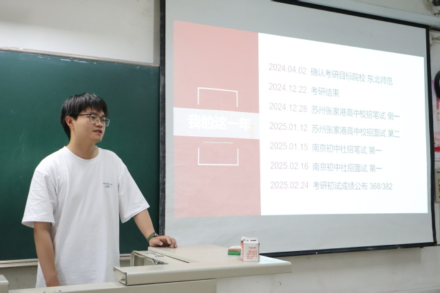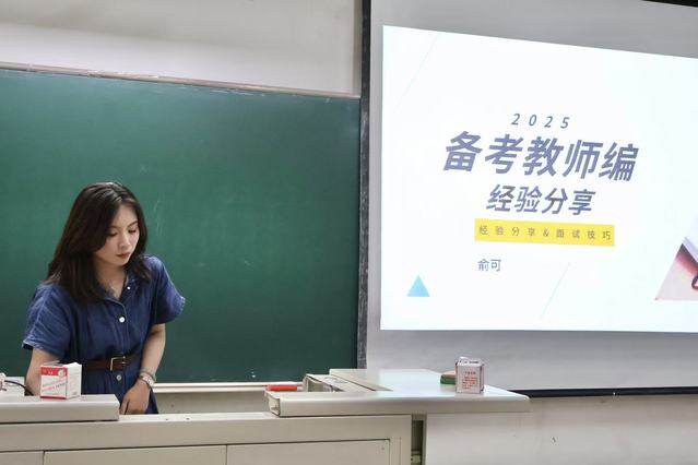 徐彬斌围绕教师编考试特点,从时间规划、备考侧重、应试技巧三方面展开。他对比了校招与社招的选拔机制差异,强调练好师范生“三字一话”基本功的重要性,建议同步准备高中、初中双线教资考试以提升成功率。俞可详细介绍了从信息获取、教案设计到面试应对等环节的注意事项,她认为定期浏览教育人才网等官方平台,关注考编通等官方公众号可以提升上岸的可能性。她建议同学们通过情景模拟训练强化临场应变能力,在教材分析中融入区域教育特色案例。徐柯逸建议同学们先了解报考学校的考试特点,通过题型分布选择安排复习计划。她以初中道德与法治课为例,分享了资料整理方法,提出要结合新课标要求,研究教材中的重点章节,分步骤准备教学设计。蓝小钦通过视频连线向同学们分享了备考经验,她结合校招经历,鼓励同学们要在日常练习中培养清晰的表达逻辑,通过录制视频等方式反复调整教姿教态,针对不同面试环节制定应对方案。