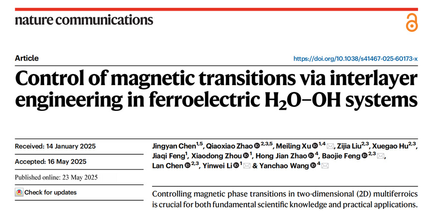 近日,物电学院物理学硕士研究生以第一作者在《Nature Communications》上发表题为“Control of magnetic transitions via interlayer engineering in ferroelectric H2O–OH systems”的文章,报道了在二维铁电体系磁性调控方面的最新研究成果。论文通讯作者为我院徐美玲副教授和李印威教授,吉林大学王彦超教授、中国科学院物理研究所冯宝杰教授。这是课题组继在《Physical Review Letters》上发表该领域重要成果后的又一重要进展。