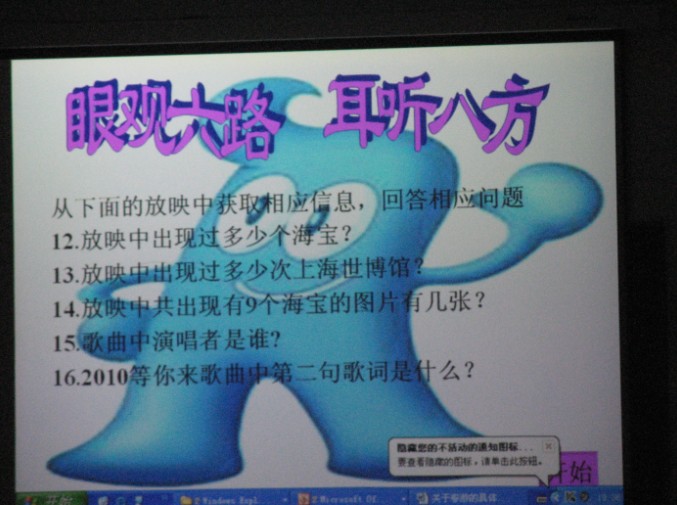活动分为世博“基本知识竞答”,“脑筋急转弯”和“连连猜”三个环节。“基本知识竞答”一方面考验的是同学们的知识储备,另一方面也调动同学们关心时事的热情;“脑筋急转弯”环节则考验同学们的发散思维和反应能力;而“连连猜”则考验了班级同学在互不通语言的情况下相互的默契和解决问题的能力。活动中,班级同学积极答题,表现非常出色。同学们在学中玩,在玩中学。此次知识竞答活动获得很好的效果,得到了同学们的积极响应和广泛支持