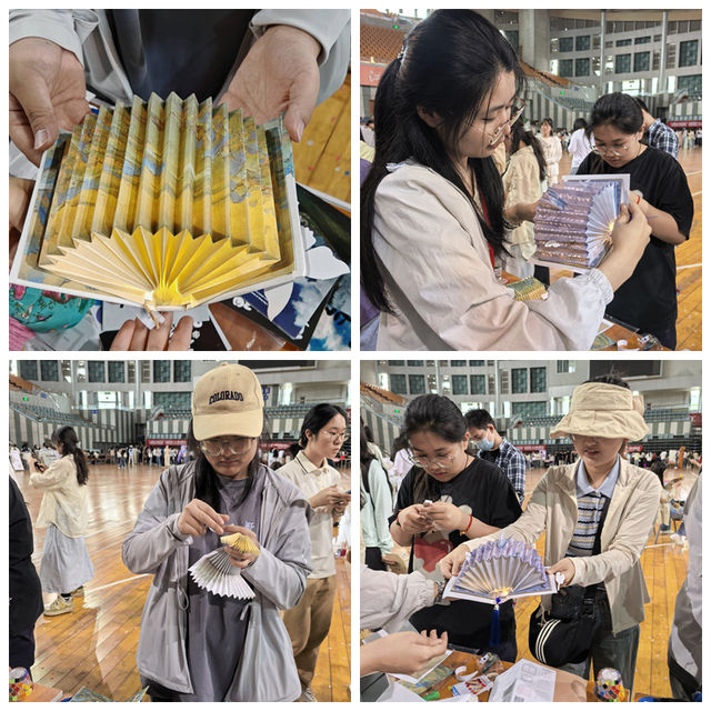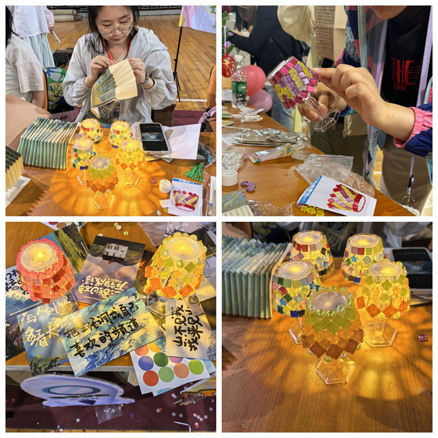 活动现场设置两大创意体验区。中国风扇形书灯DIY区,同学们手持“千里江山图”“只此青绿”等主题扇面,通过折叠、嵌合等工艺制成立体书灯,并连接可调节亮度的LED灯带。同学们完成作品后表示:“合书灯时,青绿山水随光线渐次舒展,焦虑感也随之消散。”马赛克台灯创意区,同学们在组装完成的灯罩上,用彩色玻璃碎片拼贴出星芒、波纹等图案。在场同学表示:“灯光透过马赛克投射出的光影,像把坏情绪打碎后重组的美好。”