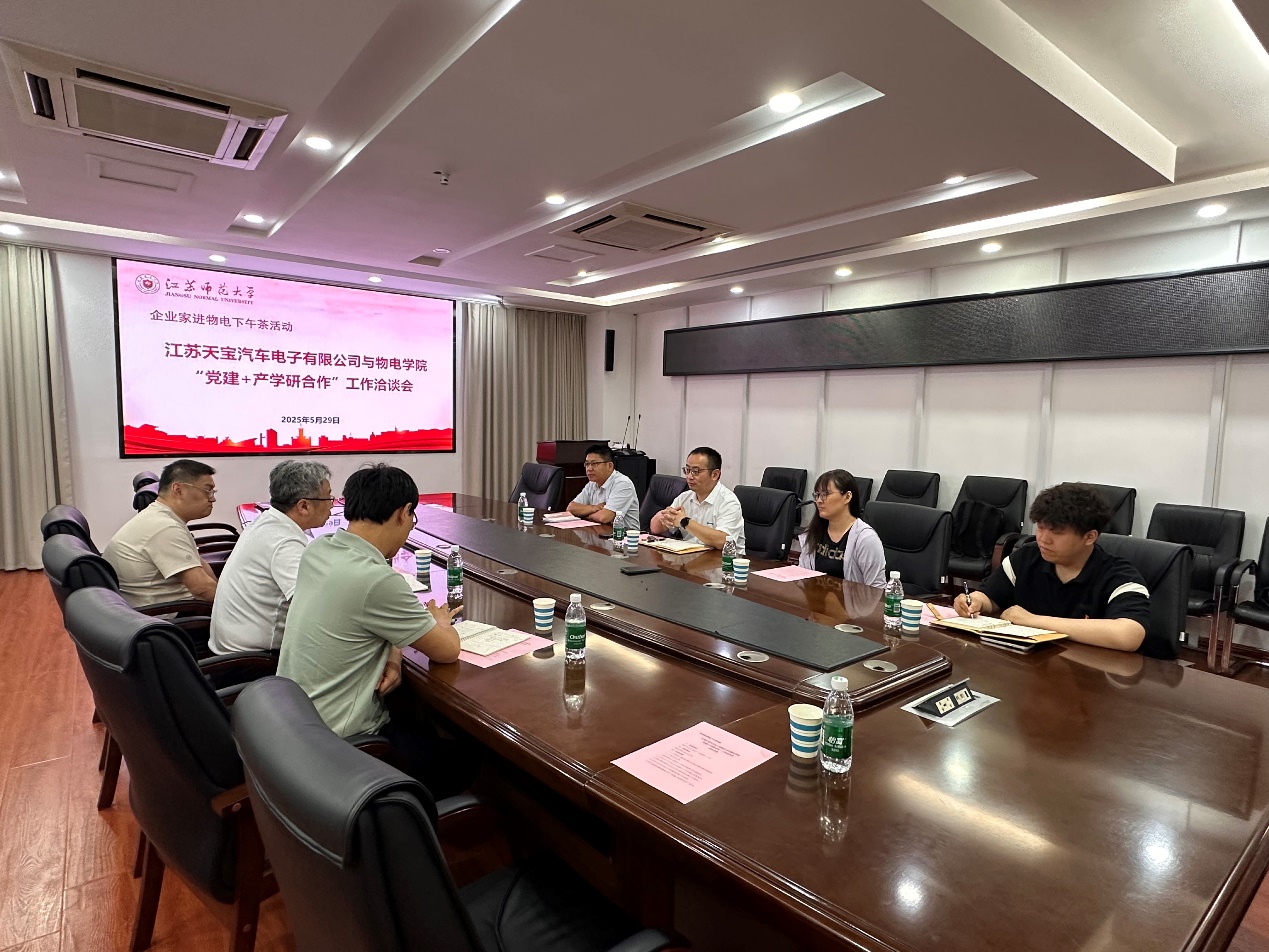 王福礼介绍了江苏天宝汽车电子有限公司及研发部的整体情况。他指出,当前企业发展面临着激烈的竞争,能否扩大市场,研发工作非常重要。为了提高公司效能,强化与高校的合作是优选之路,与物电学院开展合作和深入交流后,公司研发部与物电学院在人才培养和多个技术领域擦出很多“火花”。公司党委希望通过“党建+产学研合作”的形式全方位打开与物电学院的合作局面,把企业的产业优势和高校的智力优势结合,实现共赢。