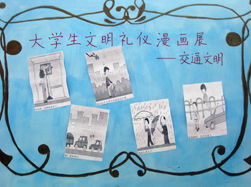 为提高大学生文明礼仪修养,加强大学生交通文明意识,机电工程学院女生部举办“五月大学生文明礼仪漫画展之四——交通文明”。