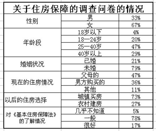 当我将要完成预计的任务时,我已经是又累又渴,但是当我看到那近100张调查问卷,我顿时倦意全无,心中感到无比自豪。通过这次的问卷调查,我进一步了解了“住房保障制度”相关的惠民政策,更加懂得了该如何和不同的人打交道,在不同的场合,我该怎样向他人表达自己的想法、目的。最重要的是它给了我的一次了解社会,认识社会的机会,同时增加了我认识问题,分析问题,解决问题的能力,为将来步入社会打下了良好的基础。