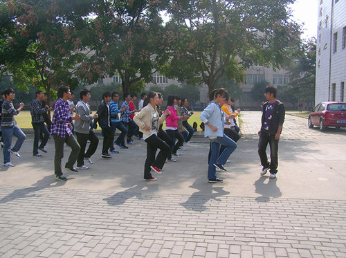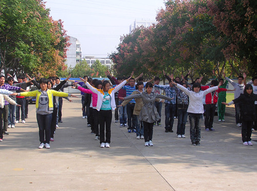 10月19日中午12点15分,全体方阵队员一如既往的提前到达工学院前的训练场地。从早到的同学们均在旁若无人的认真练习所学内容可以看出,经过连日的训练,我院方阵已经是一支有组织、有纪律的积极队伍。只听见体育部长一声哨响,原本在自顾练习的队员们由原来的松散迅速变为整齐的预演队形。音乐声响起,同学们便开始随着节奏演练自己的动作。整个过程中,同学们的动作整齐划一,整体效果非常好。