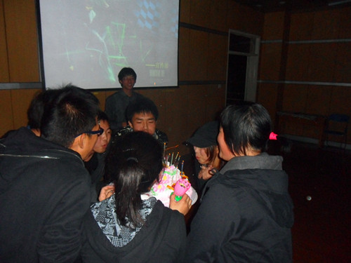 当社员徐静被成功留在舞台上正不知所以然时,灯光熄灭,一个被很多人簇拥的大蛋糕被捧了出来,此时大家不约而同的唱起了《生日歌》,面对这突如其来的惊喜徐静感动不已,在众人吹熄蜡烛的瞬间,全场洋溢着温馨的气息,不仅把整场的氛围推向了高潮,也令人切实感受到了英语研学社就是一个大家庭。最后,晚会在一个类似于“击鼓传花”的小游戏中渐渐落下帷幕。