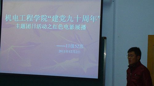 为营造优良学风,增强学生对革命的理解,机电工程学院11机52班于12月2日晚上7:00在工学院306C开展了由分团委组织的红色电影展播活动,11机52班观看了展现中国革命先烈年轻时代的电影——《建党伟业》。