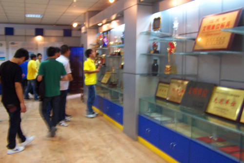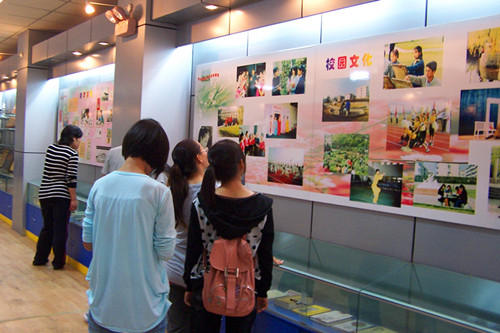 9月14日下午2点30分,我院学生开始以班级为单位进入位于钟楼8楼的校史馆。馆内墙壁上的展板一一列出了我校的发展历程以及目前取得的瞩目成就。玻璃橱柜里也摆放了许多相关历史文献资料,展台上更是陈列了琳琅满目的证书、奖杯。