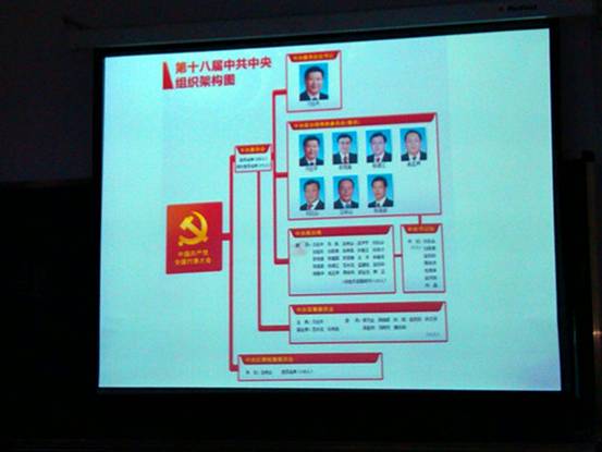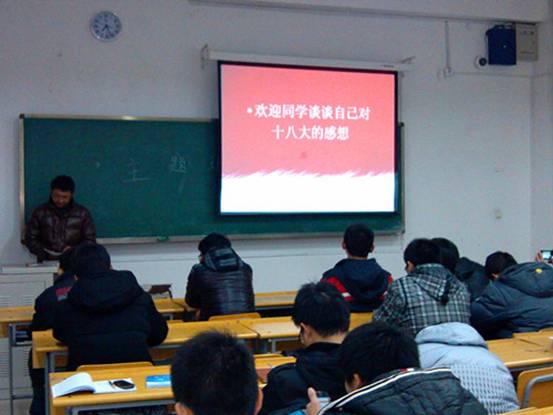 晚上7点整,主题班会准时开始,班级团支书赵锋同学首先介绍了党的十八大的一些基本信息,使同学们对十八大有了一个整体的了解。紧接着戴杨同学领唱了一首《没有共产党就没有新中国》活跃了班级气氛,点燃了同学们的激情。为了加强同学们对党的新一届委员会委员的了解,赵锋同学还一一介绍了习近平、李克强等委员,并播放了胡主席的十八大报告视频,视频中胡主席总结了五年来所取得的成果并对未来充满信心,同学们认真观看,目不转睛,并不时响起自发的掌声。视频播放结束后,陈红达、张晓芳、王飞翔等同学分别讲述了自己对十八大的感悟,大家也燃起了渴望学习十八大的积极性。最后赵锋同学又为大家讲解了十八大报告中的八大亮点,并作了一个简短而有力的总结,至此,主题班会圆满结束。