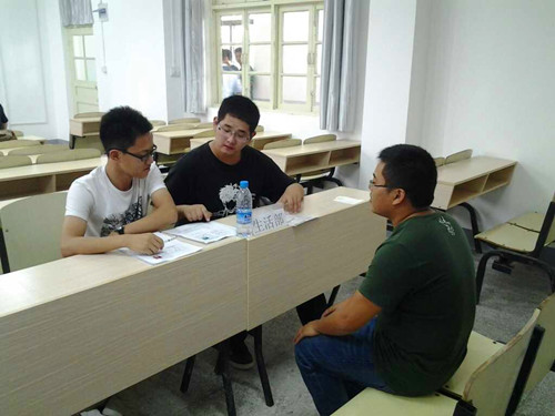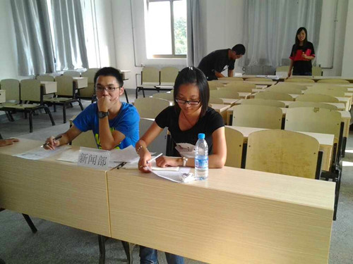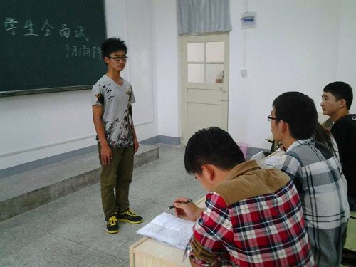 学生会初试定于下午一点正式开始,同学们早早的来到准备室等待,教室里布满了紧张、略带羞涩的面庞,各部门部长也在积极地准备面试问题。面试开始,同学们井然有序的进入教室,在郑重地递交完报名表后,首先作简要的自我介绍,接下来回答部长们提出的问题,这也是全面考察他们能力与工作态度的时刻。第一轮面试结束,各位部长们都对前来面试的同学进行了初步的考核,紧接着,秘书部、新闻部、外联部、文艺部进行了复试,这一轮是对本部门专业技能的考核,外联部的辩论赛进行的尤为激烈,他们以“网络用语是丰富还是污染了我们的生活”和“大学生该不该找兼职”为话题展开辩论。