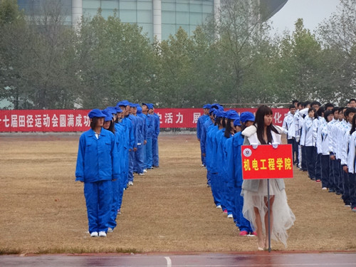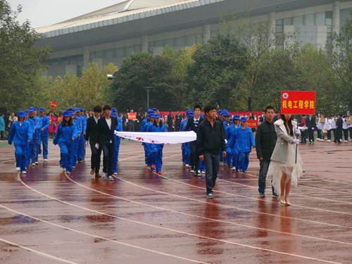 开幕式在悠扬的运动员进行曲中拉开序幕。各个学院的方阵依次入场,并带来了精彩的艺术表演。我院的方阵迈着整齐有力的步伐,昂首阔步向主席台走来。深蓝色的制服彰显出同学们的深沉与干练。整齐划一的步伐更突显出同学们的团结一致。与此同时,机电DFF街舞社动感的舞步犹如一把熊熊烈火,在这略显寒冷的深秋,为在场的所有师生带来了无限的温暖与激情。